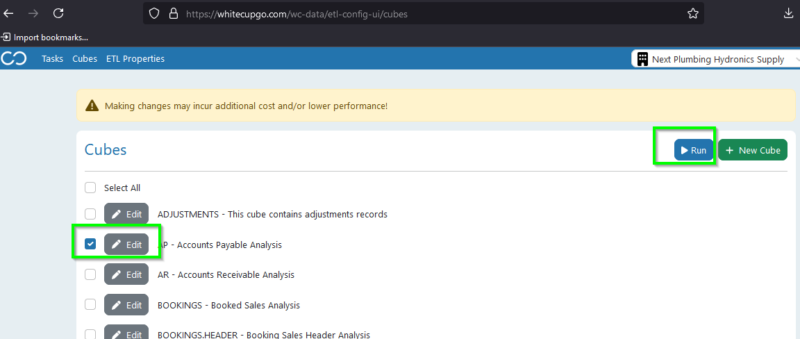 - Select which cube or cubes you would like to run and then click on the "Run" button. Example shows the AP cube for visual purposes since it is at the top of the screen but we will be kicking off the SALES cube.